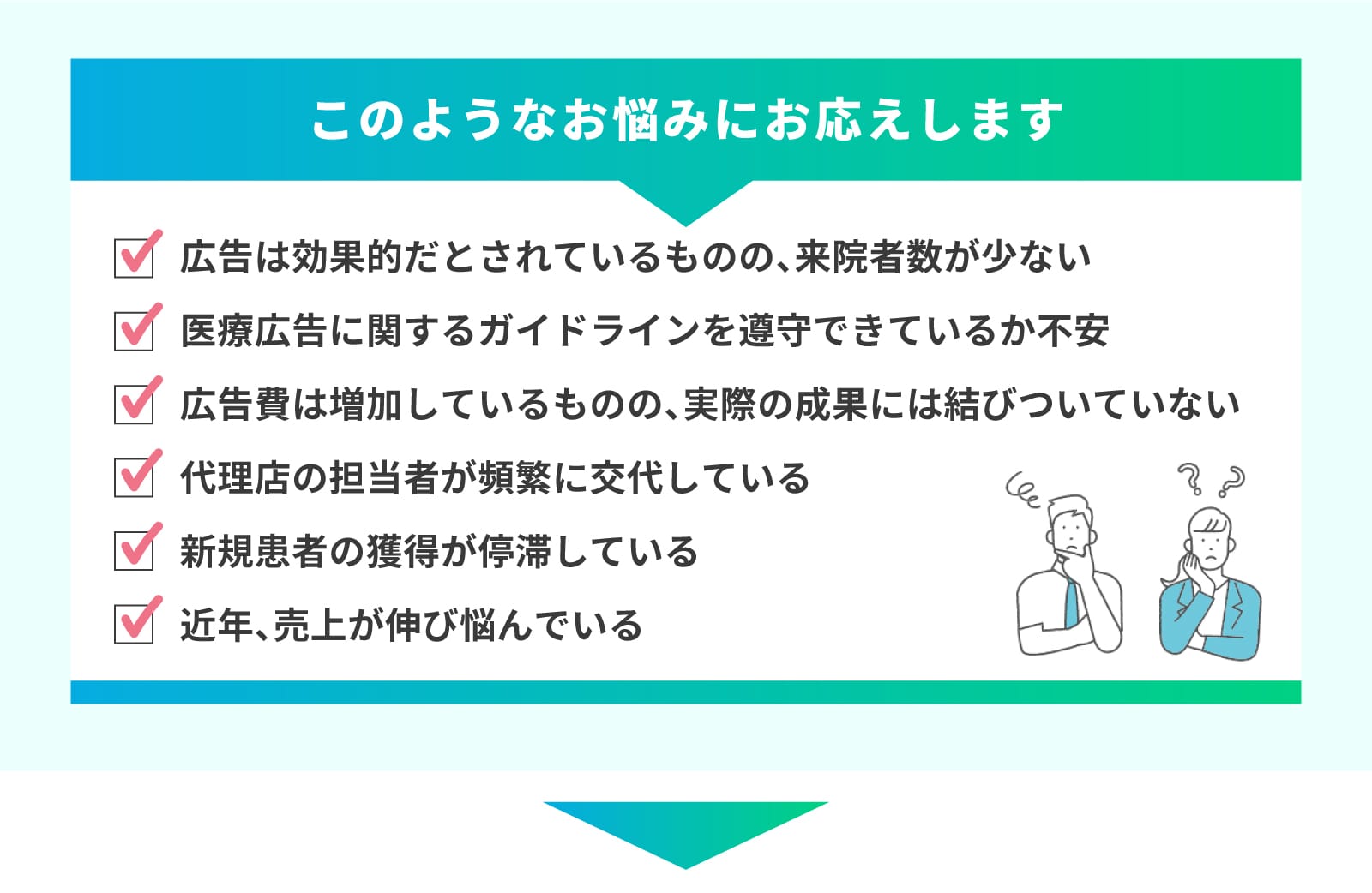私たちは医療広告に関するガイドラインを遵守し、適切な形でのプロモーションを実施いたします。最終的な判断はクリニック様にお任せいたしますが、正当な手段を用いて透明性のあるマーケティングを行います。