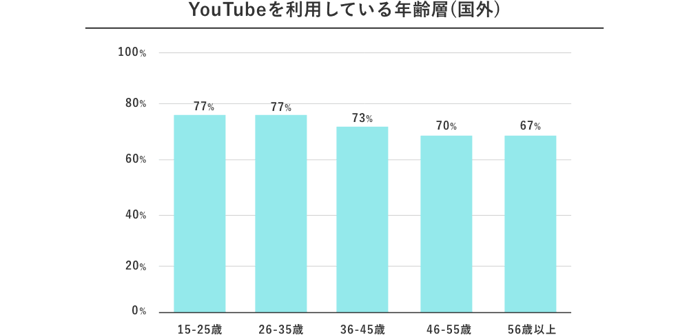 YouTubeは、Googleに次いで世界で最も利用されているウェブサイトの一つです。「YouTube by the Numbers」によると、2020年の時点で世界中の月間アクティブユーザー数は20億人に達し、1日のアクティブユーザー数は3,000万人を超えました。また、1日に視聴される動画の本数は10億本以上に上り、非常に多くのユーザーがYouTubeを活用していることが明らかです。国外のデータに基づくと、年齢層に関しては下のグラフの通り、幅広い年齢層のユーザーが存在しています。